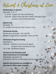 This year, we will be offering in-person midweek Advent services on December 3, 10, and 17. These services will begin at 6:05 PM and feature Holden Evening Prayer. All services will be livestreamed.